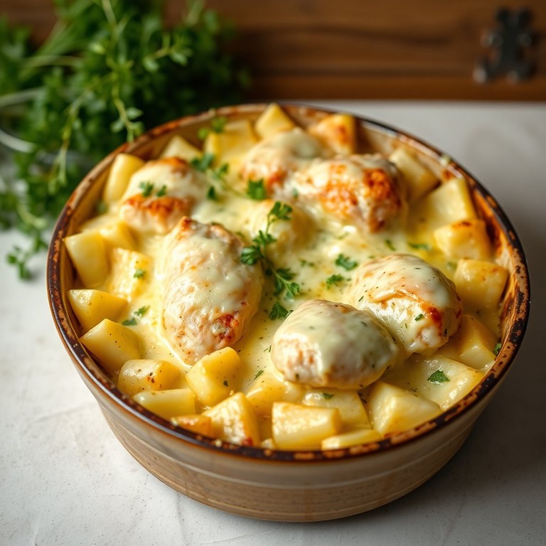 Ein schichtweise gebackenes Gratin, das zarte Hähnchenstücke, feinen Fenchel und geschmolzenen Käse vereint.