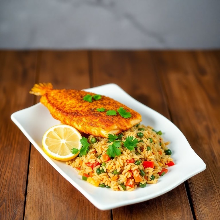 Knuspriger gebratener Fisch mit buntem Gemüse-Reis
