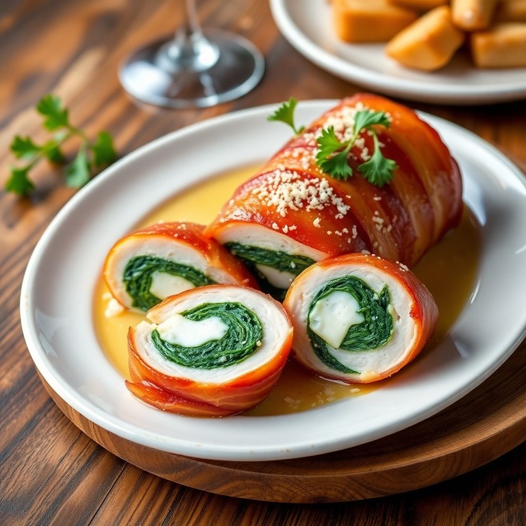 Zarte Hähnchenbrust, gefüllt mit einer Mischung aus Spinat und Ricotta, umhüllt von knusprigem Bacon. Ein elegantes Gericht, das sich gut vorbereiten lässt und beeindruckt.