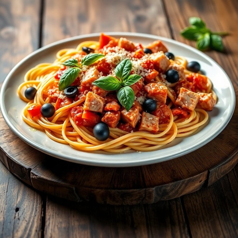 Hausgemachte Thunfisch-Bolognese, verfeinert mit sonnengetrockneten Tomaten, Kapern und Oliven, serviert mit frisch gekochter Pasta. Ein mediterraner Klassiker mit einer überraschenden Wendung.