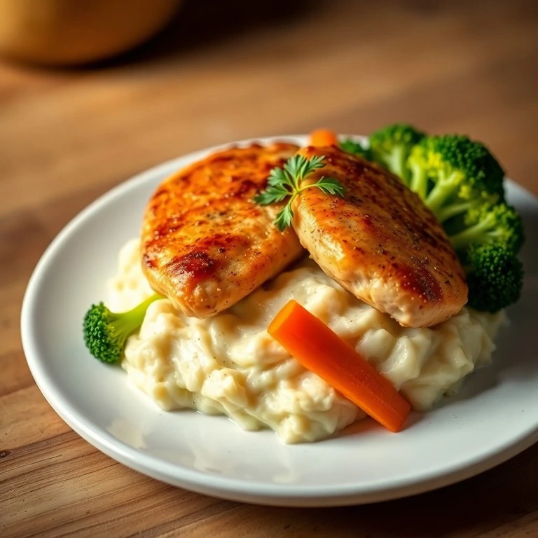 Gebratene Hähnchenbrust serviert auf einem Bett aus cremigem Kartoffelpüree und gedünstetem Brokkoli-Karotten-Gemüse. Ein schnelles und gesundes Gericht.