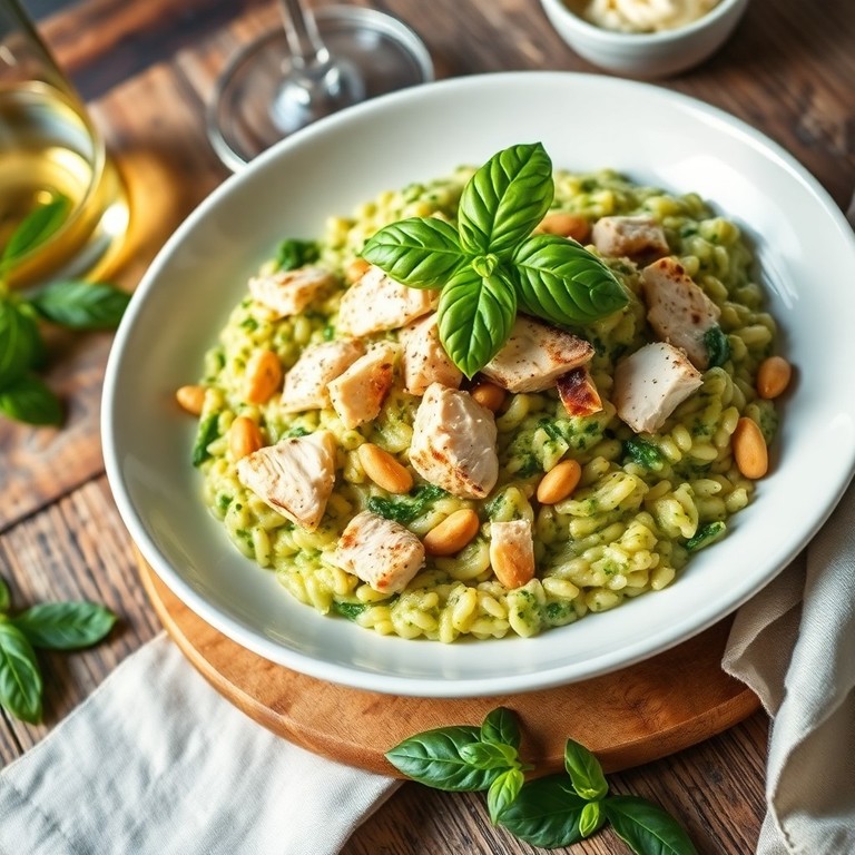 Creamy pesto chicken served over parmesan risotto, topped with toasted pine nuts and fresh basil. A comforting and flavorful Italian-inspired dish ready in under 45 minutes.