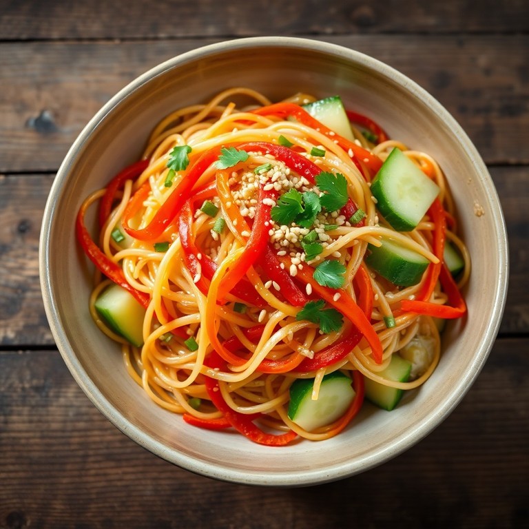 Une salade de nouilles de riz vibrante et rafraîchissante, parfaite pour un déjeuner léger ou un accompagnement, avec une vinaigrette acidulée au sésame et des saveurs de Pad Thaï.