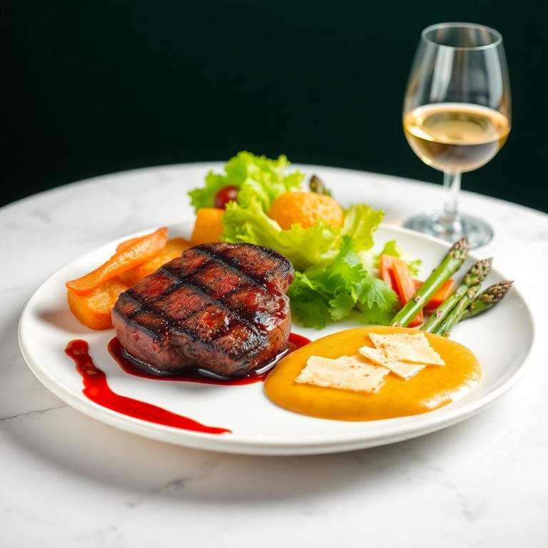 Filete de Res en Reducción de Vino Tinto con Papas al Horno, Ensalada Fría y Crema de Espárragos con Crujientes de Parmesano