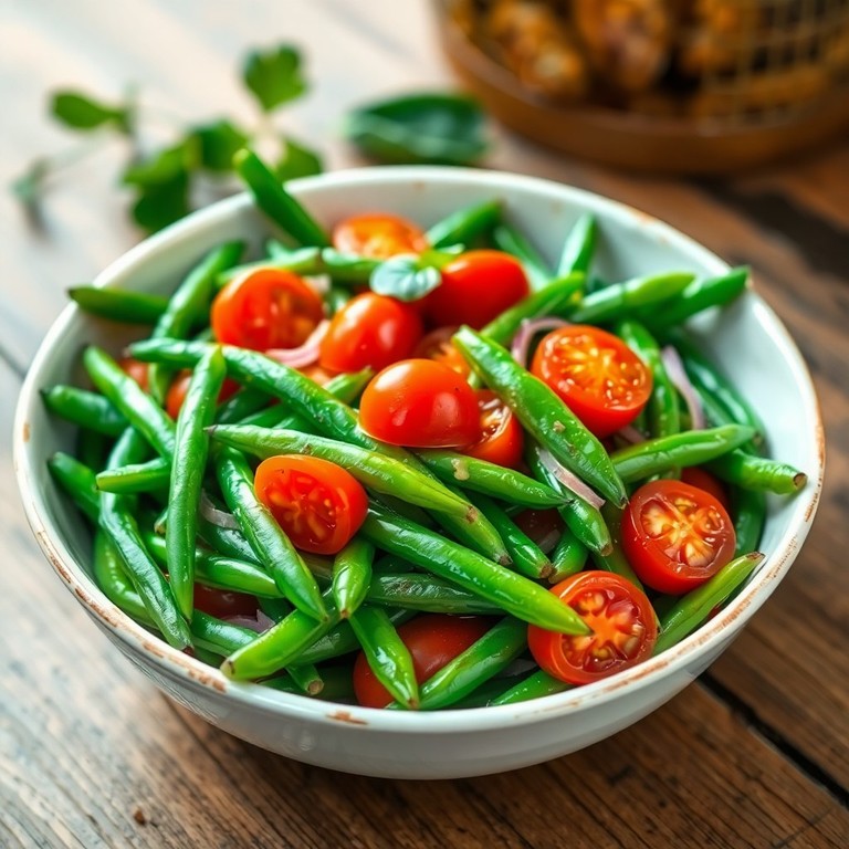 Uma salada refrescante e crocante de feijão verde com tomate cereja, temperada com azeite, vinagre e cebola roxa, perfeita para acompanhar entremeadas grelhadas.