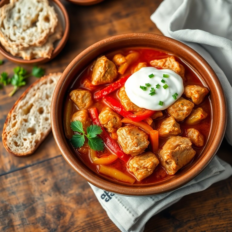 Traditionelles ungarisches Eintopfgericht mit zartem Huhn, aromatischem Paprika, Zwiebeln und cremiger saurer Sahne. Dieses Gericht besticht durch seine reichhaltige Würze und die harmonische Kombination aus Paprika und Kümmel, perfekt für gemütliche Abende.