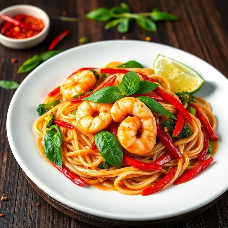 A fiery and aromatic Thai stir-fried noodle dish featuring wide rice noodles tossed with chili, garlic, fresh basil, and crisp vegetables, cooked with succulent shrimp or chicken. This bold and flavorful Pad Kee Mao delivers a perfect balance of heat, savory depth, and herbal freshness, ideal for those craving authentic Thai street food at home.
