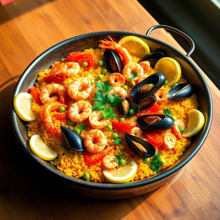 Un clásico plato valenciano con arroz bomba, mariscos frescos como gambas, mejillones, almejas y calamares, aromatizado con azafrán y pimentón dulce. Ideal para compartir en una comida festiva con un toque mediterráneo auténtico.