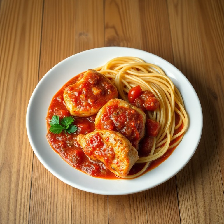 Uma receita suculenta de sobrecoxas de frango cozidas em molho caseiro de tomate com alho e cebola, acompanhadas de macarrão. Fácil de preparar, é perfeita para um almoço reconfortante com sabor marcante.