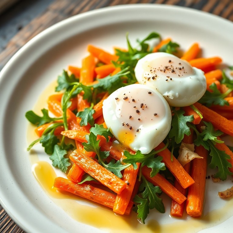 Una ensalada cálida y saludable que combina zanahorias al vapor tiernas, queso derretido y huevos pochados con yema líquida, acompañada de rúcula fresca y un aliño simple de aceite de oliva y vinagre. Ideal para un almuerzo ligero y nutritivo.
