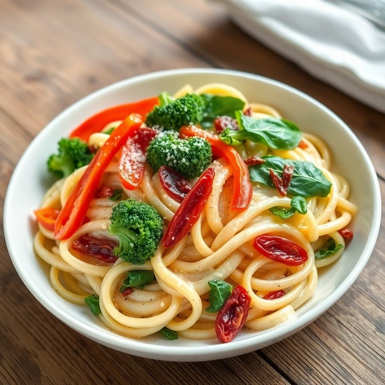 Eine cremige Nudelpfanne mit Paprika, Brokkoli, frischem Blattspinat und getrockneten Tomaten, die in einer sahnigen Sauce vereint werden. Dieses Gericht ist in weniger als 30 Minuten zubereitet und bietet ein harmonisches Geschmackserlebnis voller frischer Farben und Aromen.