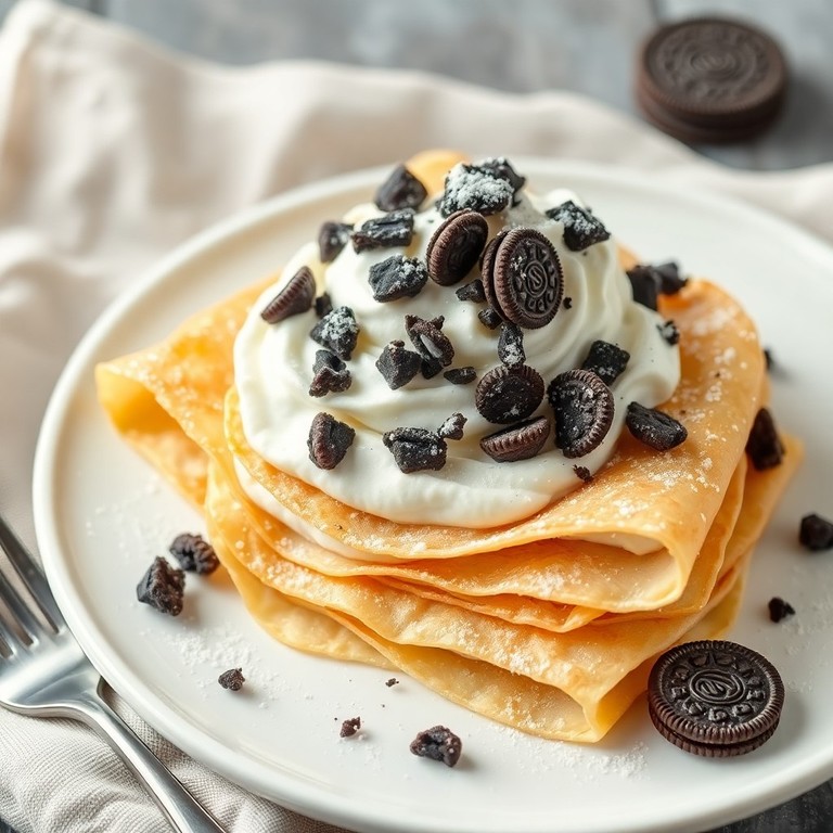 Delicate, thin crepes filled with crushed Oreo cookies and whipped cream, perfect for a quick dessert or breakfast.