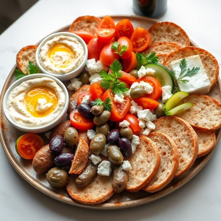Dieses mediterrane Mezze-Teller vereint frischen Hummus, aromatisches Gemüse, Oliven, cremigen Feta, Dolmadakia und eine würzige Makrelen-Sandwichpaste. Die Makrelenpaste ersetzt das gegrillte Filet und sorgt für eine unkomplizierte, streichfähige Variante, die perfekt zu Brot passt. Ideal für gesellige Abende und ein Genuss für Liebhaber der mediterranen Küche.
