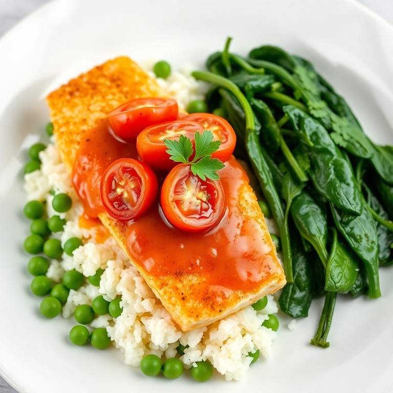 Una receta saludable y rápida que combina filetes de pescado crujiente con una salsa fresca de tomate cherry y naranja, acompañada de espinacas salteadas y arroz con arvejas. Ideal para un almuerzo nutritivo y lleno de sabor.