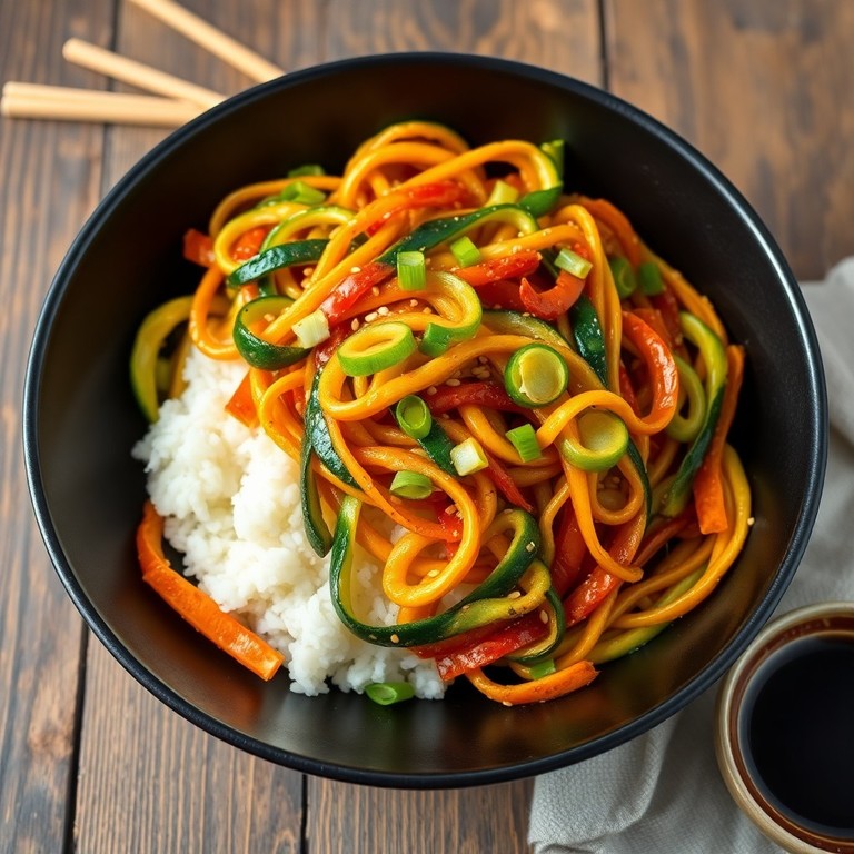 Knackige Zucchini und feine Süßkartoffelstreifen werden in einer würzigen Sojasauce mit frischem Ingwer sanft gegart und mit lockerem Reis kombiniert. Dieses vegane Gericht ist herzhaft, aromatisch und schnell zubereitet – perfekt für ein gesundes Mittag- oder Abendessen.