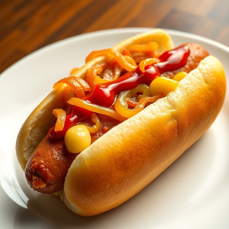 Ein klassischer amerikanischer Hot Dog im weichen Brötchen, belegt mit gedünsteten Zwiebeln, Senf und Ketchup. Dieses schnelle und einfache Rezept bringt den beliebten Snack direkt auf den Teller und lässt sich nach Belieben mit Gewürzgurken oder Röstzwiebeln verfeinern.