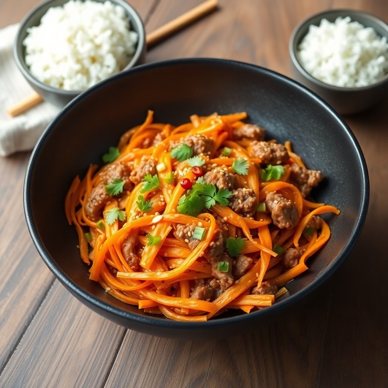 Ein schnelles und aromatisches Wok-Gericht mit frisch geriebenen Möhren und würzigem Hackfleisch, das in nur 20 Minuten zubereitet ist. Die Kombination aus Sojasauce, Austernsauce und Sesamöl verleiht der Pfanne eine authentische asiatische Note. Ideal für alle, die eine unkomplizierte, gesunde Mahlzeit mit viel Geschmack suchen.