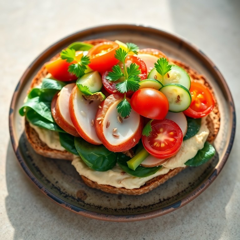 Este sándwich mediterráneo, ahora con dos rebanadas de pan integral de centeno, es ideal para mujeres con Síndrome de Ovario Poliquístico. Mantiene ingredientes de bajo índice glucémico, proteínas magras y grasas saludables, perfecto para un almuerzo saciante y equilibrado en una sola porción.