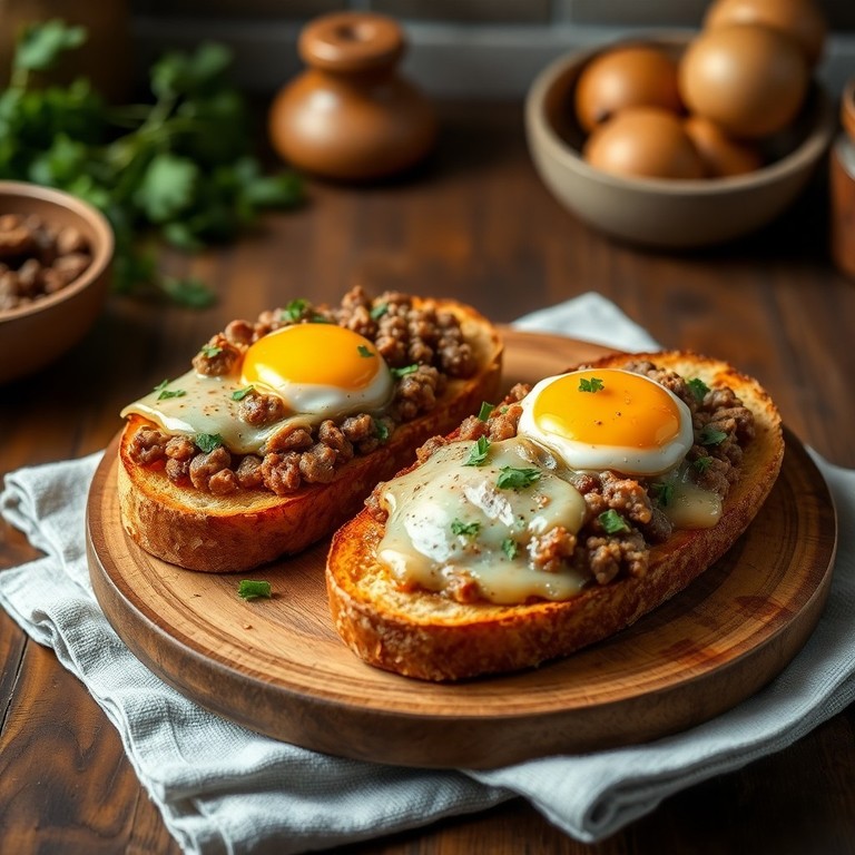 Knuspriger Toast belegt mit würzigem Hackfleisch, einem Spiegelei und geschmolzenem Käse, im Ofen überbacken – ein herzhafter Snack oder ein sättigendes Frühstück, das einfach zuzubereiten ist.