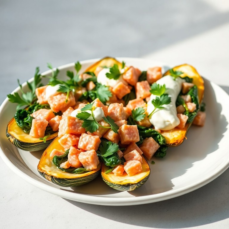 Ofengebackene Zucchinihälften, gefüllt mit einer cremigen Mischung aus frischem Lachs, Blattspinat und Creme fraîche, verfeinert mit Zitrone und Koriander. Dieses elegante Gericht ist schnell zubereitet und eignet sich perfekt als leichtes Hauptgericht oder raffinierte Vorspeise.