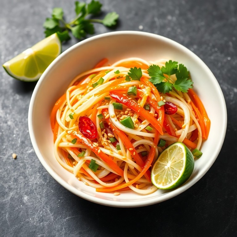 Ein erfrischender, asiatisch inspirierter Salat aus rohem Kohlrabi, verfeinert mit Limette, Ingwer und Sesamöl. Dieser knackige Salat ist kalorienarm, vegan und kommt ganz ohne Fleisch, Eier oder Soja aus – perfekt als leichte Mahlzeit oder Beilage.
