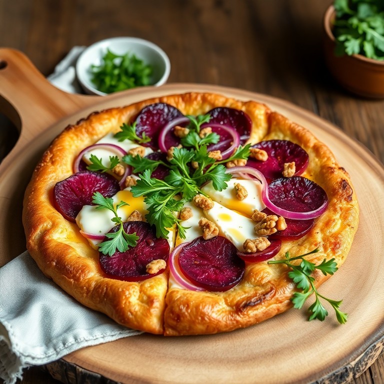 Diese kreative Flammkuchen-Tarte kombiniert den knusprigen Boden eines klassischen Flammkuchens mit cremigem Ziegenkäse, süßer Rote Bete und frischen Kräutern. Dank fertigem Flammkuchenteig ist sie schnell zubereitet und eignet sich perfekt als Vorspeise, leichtes Hauptgericht oder für gesellige Abende. Die Kombination aus erdiger Rote Bete, würzigem Ziegenkäse und einem Hauch Honig sorgt für ein harmonisches Geschmackserlebnis.