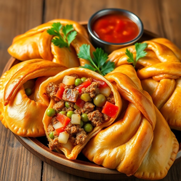 Salteñas sind ein traditioneller bolivianischer Snack: goldbraun gebackene Teigtaschen, gefüllt mit einer würzigen, saftigen Mischung aus Rindfleisch, Gemüse und aromatischen Gewürzen. Die Füllung ist leicht sämig und enthält oft eine dezente Schärfe, während der Teig süßlich und zart ist. Perfekt als Snack, zum Mittagessen oder für unterwegs.