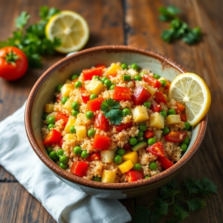 Eine schnelle und gesunde Gemüse-Quinoa-Pfanne, die in nur 20 Minuten zubereitet wird. Dieses Gericht kombiniert proteinreiche Quinoa mit buntem, frischem Gemüse und einer leichten Gewürzmischung für eine nahrhafte und schmackhafte Mahlzeit, ideal für den Alltag.