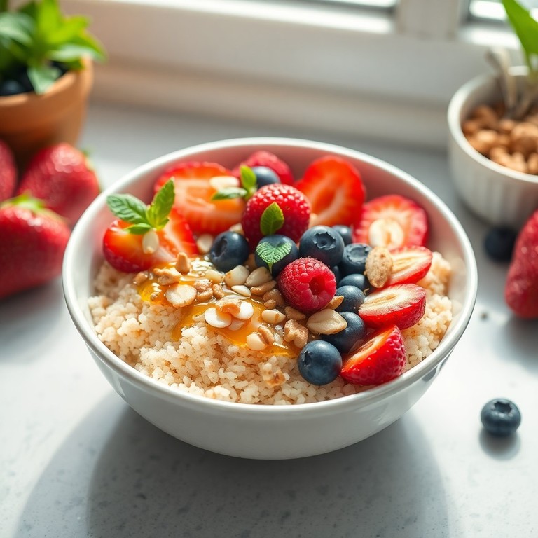 Ein nährstoffreiches, glutenfreies Frühstück voller Antioxidantien, Vitamine und gesunden Fetten, ideal für einen energiegeladenen Start in den Tag. Diese Frühstücksschüssel kombiniert fluffig gekochte Quinoa mit einer bunten Mischung aus frischen Beeren, knackigen Nüssen und einem Hauch Honig für natürliche Süße. Perfekt für alle, die einen gesunden und sättigenden Start in den Tag suchen.