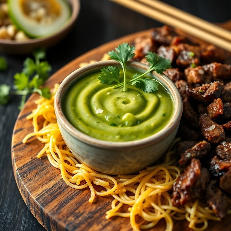Una salsa suave y picante que aporta un toque fresco y delicioso, ideal para complementar el sabor del pecho deshebrado y el arroz con fideo.