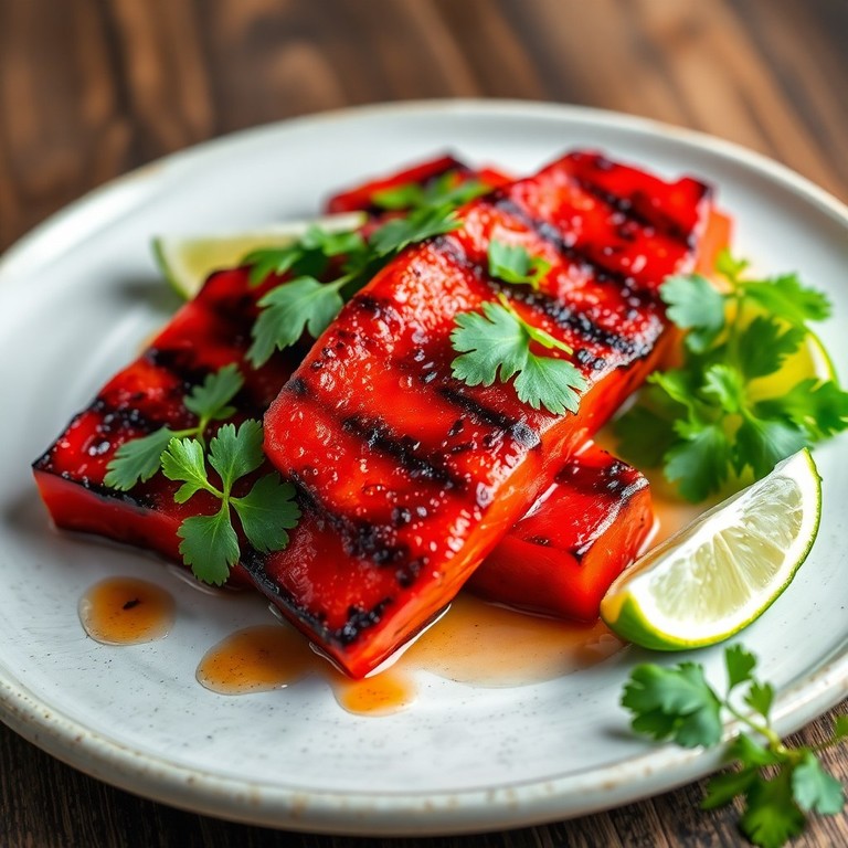This innovative dish transforms thick watermelon slices into savory 'steaks' by searing them in a hot pan and coating them with a spicy, tangy glaze. The caramelization from searing enhances the watermelon’s natural sweetness while the glaze adds a bold kick, creating a unique and refreshing appetizer or side dish that surprises the palate.