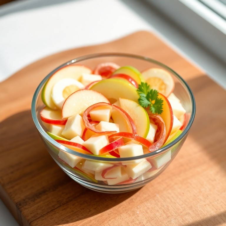 Ein erfrischender und leichter Apfel-Salat, der durch ein samtiges Milch-Dressing verfeinert wird. Die Kombination aus knackigen Äpfeln, zarten Eiern und würziger Salami macht diesen Salat zu einem idealen Genuss für zwischendurch oder als Beilage.