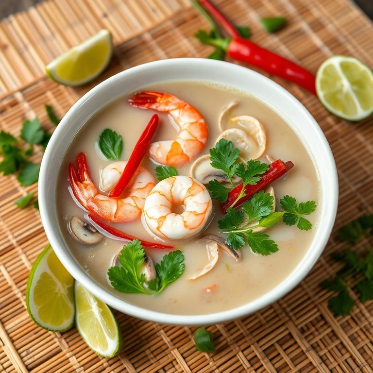 This classic Thai soup, known as Tom Kha Goong, features a fragrant broth infused with lemongrass, galangal, and kaffir lime leaves, enriched with creamy coconut milk and finished with tender shrimp. The soup balances bright citrus notes, subtle heat, and the natural sweetness of coconut, creating a comforting and authentic Thai experience. Ideal for a quick weeknight meal or an impressive starter for guests.