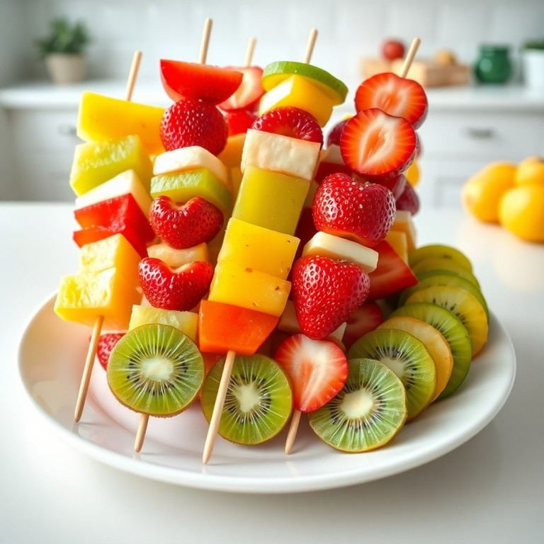 Trozos de frutas variadas ensartados en brochetas, perfectos para una merienda saludable y entretenida que los niños pueden montar y disfrutar. Esta receta fomenta la creatividad y la alimentación sana, ideal para que los niños participen en la cocina mientras aprenden sobre diferentes frutas y texturas.