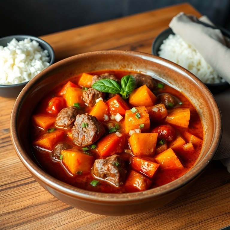 Um ensopado reconfortante e nutritivo que combina carne macia, batata doce adocicada, tomates frescos e temperos aromáticos, perfeito para um almoço saboroso e cheio de sabor caseiro.