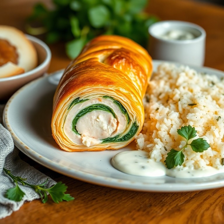 Diese herzhafte Blätterteigrolle ist gefüllt mit saftigem Putenbrustfilet, einer cremigen Mischung aus frischem Blattspinat und würzigem Schafskäse. Serviert wird sie mit lockerem Reis und einer aromatischen, selbstgemachten Kräuter-Frischkäsesoße – ein perfektes, sättigendes Gericht für die ganze Familie.