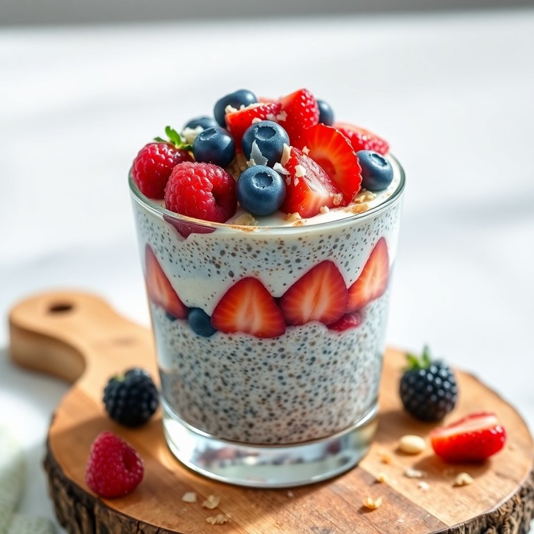 Ein schnelles, proteinreiches Dessert oder Frühstück: Cremiger Chia-Pudding wird in Gläsern geschichtet und mit frischen Beeren sowie knusprigen Nüssen verfeinert. Perfekt für einen gesunden Start in den Tag oder als leichtes Dessert.