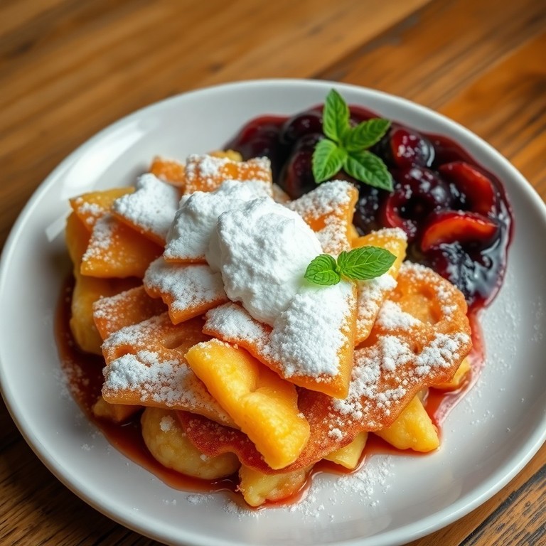 Kaiserschmarrn ist ein klassischer österreichischer Pfannkuchen, der in der Pfanne zerrupft und mit Puderzucker bestäubt wird. Das fluffige Dessert wird traditionell mit Zwetschgenkompott serviert, das eine fruchtige und leicht säuerliche Note hinzufügt. Perfekt als süße Hauptspeise oder als Dessert.