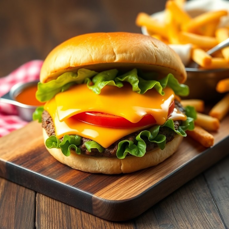 Um hambúrguer tradicional americano com carne suculenta, queijo cheddar derretido, alface crocante, tomate fresco e um molho especial cremoso, servido em um pão macio e levemente tostado. Perfeito para uma refeição rápida, saborosa e satisfatória, que agrada a todos os paladares.