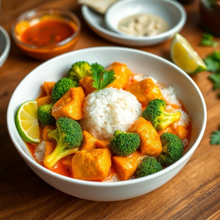 Eine schnelle und aromatische Pfanne mit knusprig gebratenem Huhn, knackigem Brokkoli und lockerem Reis, verfeinert mit einer würzigen Thai-Curry-Sauce. Dieses Gericht kombiniert asiatische Gewürze und frische Zutaten zu einem köstlichen, ausgewogenen Mahl, das in nur 30 Minuten zubereitet ist – perfekt für den Alltag.
