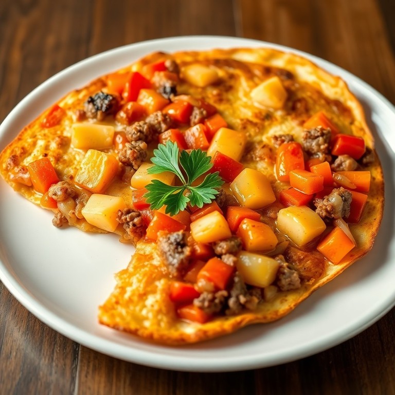 Una tortilla española enriquecida con huevo, cebolla, morrón, zanahoria y carne picada, ideal para un desayuno, almuerzo o cena rápida. Esta receta combina la suavidad del huevo con el sabor intenso de la carne y la frescura de las verduras, creando un plato completo y nutritivo.