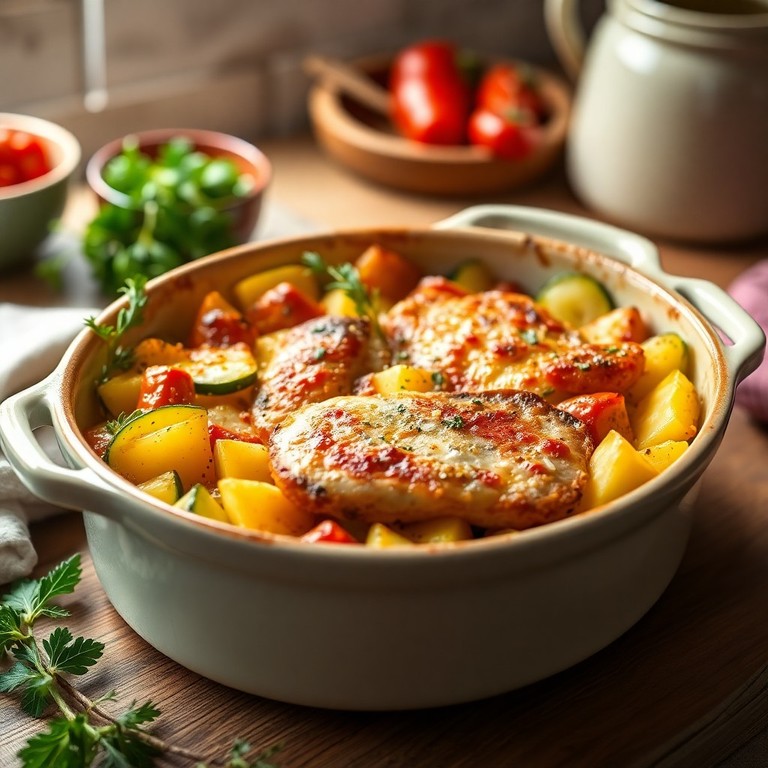 Ein köstlicher Auflauf mit Kartoffeln, Zucchini, Paprika und Schweinefilet. Die Paprika verleiht dem Gericht eine aromatische und leicht süße Note, perfekt für ein herzhaftes Abendessen.