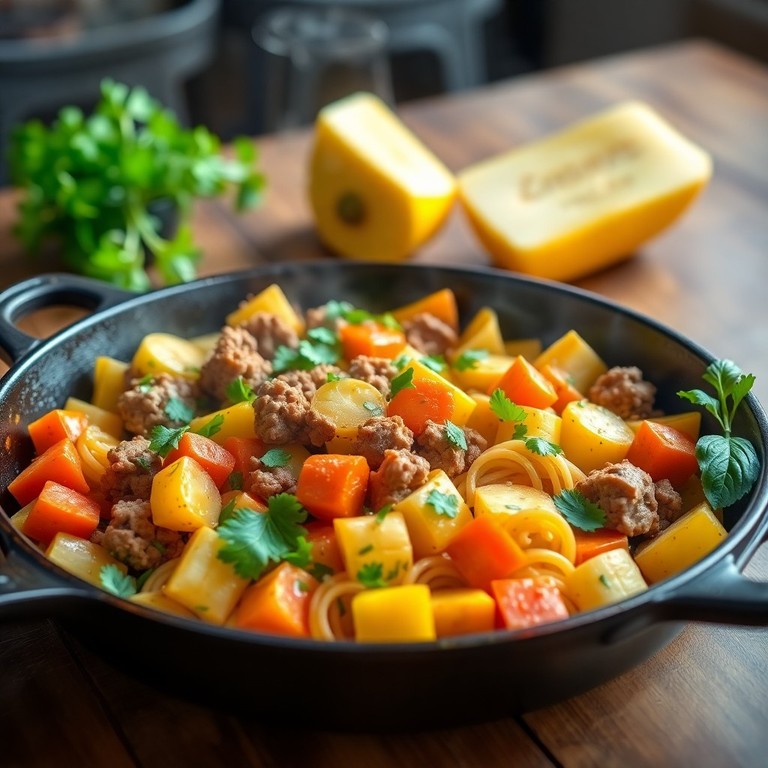 Eine nahrhafte und vollständig histaminfreie Pfanne mit zartem Rinderfaschiertem, histaminarmem Gemüse wie Lauch, gelber Paprika, Kartoffeln, den zusätzlichen süßen Noten von Karotten und Zucchini, verfeinert mit frischen Kräutern. Ideal für eine verträgliche, sättigende Mahlzeit.