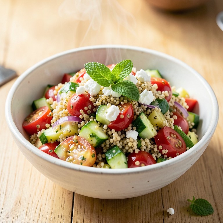 Una ensalada mediterránea vibrante y nutritiva, cargada de quinoa esponjosa, garbanzos sustanciosos, vegetales frescos y un toque de queso feta. Se complementa con un aderezo cítrico de limón y hierbas frescas, ideal para una comida ligera y llena de energía.