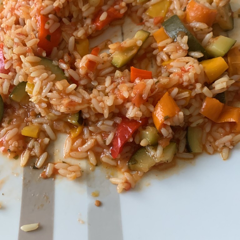 Ein herzhafter und farbenfroher One-Pot-Eintopf, der frisches mediterranes Gemüse mit lockerem Reis in einer aromatischen Tomatenbrühe vereint.