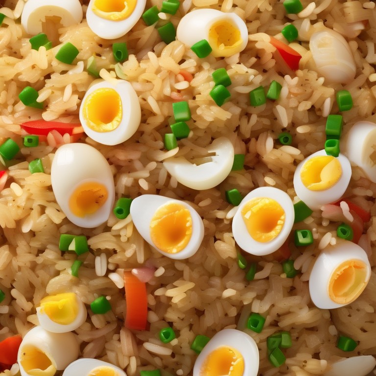 Ein köstliches und herzhaftes Reisgericht mit Kartoffeln, Eiern, Zwiebeln, Knoblauch und Paprika.
