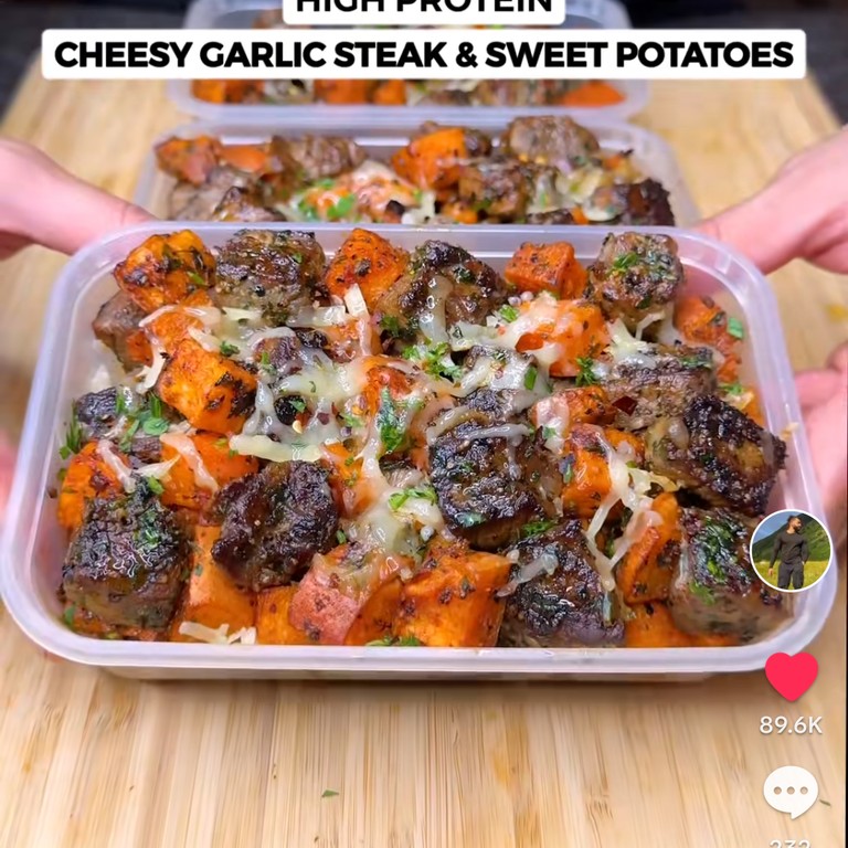 High Protein Cheesy Garlic Steak & Sweet Potato Bits!