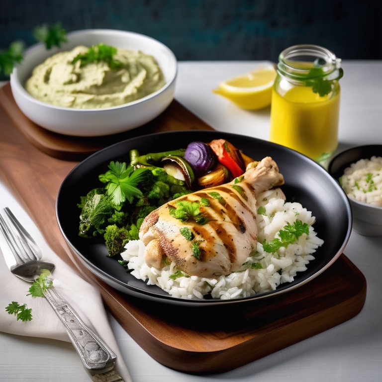 - Lemon-Garlic Marinated Pounded Chicken with Grilled Vegetables and Parsley Hummus