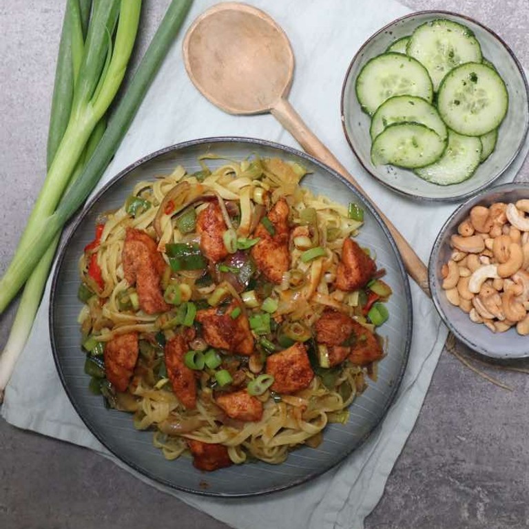 - Gebraden kippendij met noedels en ketjapjus met oosterse groenten en zoetzure komkommer