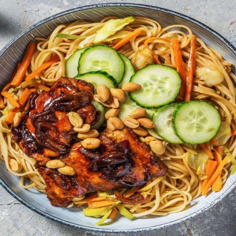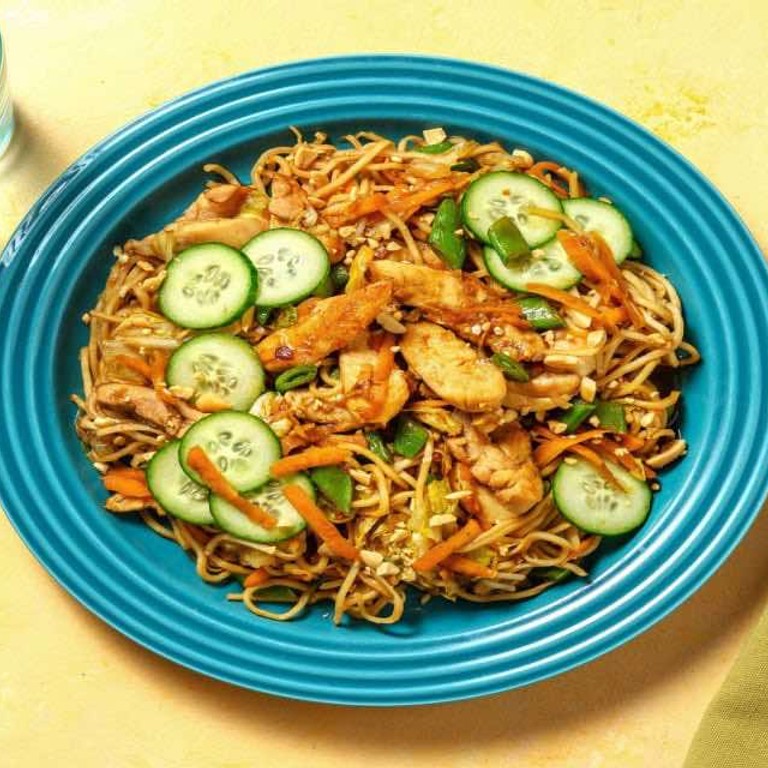 - Gewokte noedels met kippendijreepjes in teriyaki met Oosterse groentemix, pinda's en komkommer